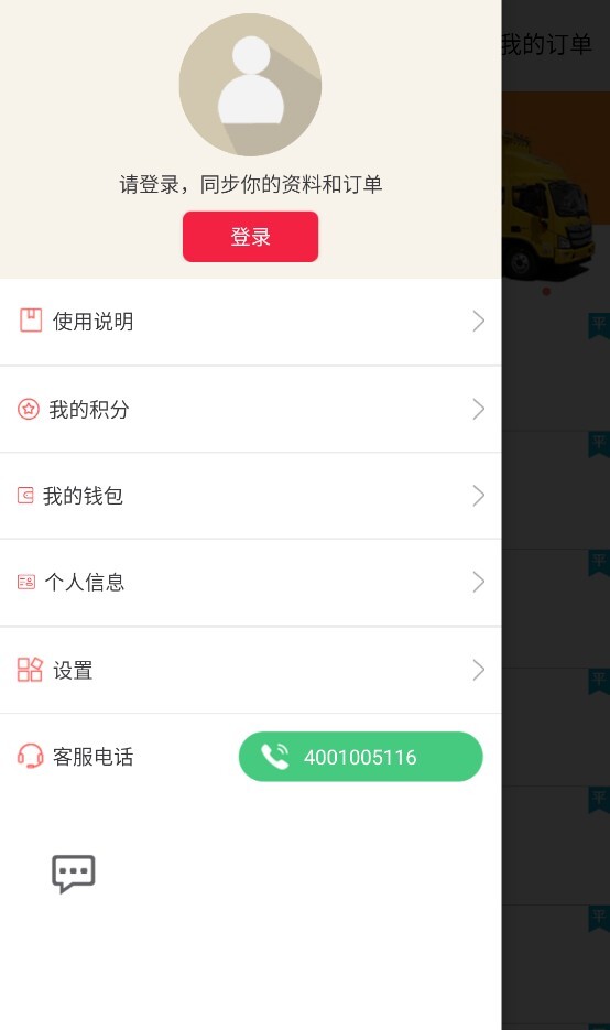 3、点击左上角的菜单按钮,即可打开侧边栏,其中涵盖登录入口、积分、钱包、设置、个人信息以及客服电话等功能选项。