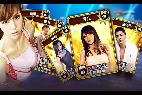 2.通向成功的旅程并不总是荆棘丛生,也有红袖添香助你事半功倍。游走在《绿茶妹》的世界里,夜店、豪宅、KTV林立的街头,邂逅你命中注定的女神。萌妹、美女两大阵营与魔界、土豪分庭抗礼。海量真人热图,囊括天南海北当红嫩模、清纯校花,网络红人,庞大的美女卡牌阵容有图有真相,令贪婪心魔闻风丧胆。