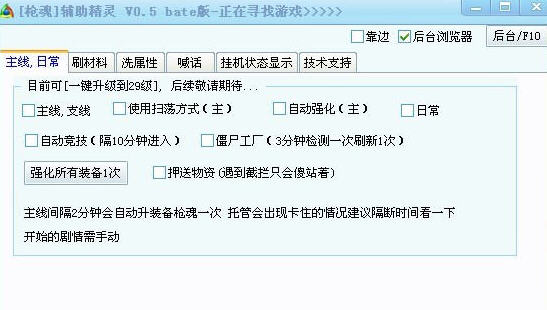 本插件可以代替玩家操作,省下时间与精力,带来更好的游戏体验。目前可以一键自动刷主线,刷日常,自动强化,自动竞技场,自动培养僵尸,押送物资(被劫不会反击),快速洗属性,自动刷材料等功能。