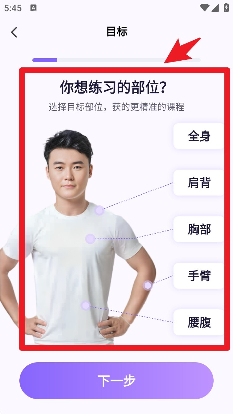 3. 在目标设定页面挑选你想要锻炼的身体部位,例如全身、腰腹部、肩背部等,课程将会根据你的选择进行精确定制。