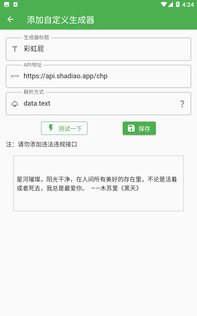 3、也可以自定义生存器,输入标题、地址和解析方式。
