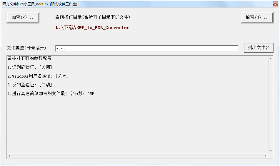 阳光文件加密工具可以加密指定文件夹下的重要文件,加密后,即便硬盘或U盘被盗去,文件的内容也不会泄密。解密后即可正常操作文件,加密一次后,以后的加密都是一键完成,操作便捷。因为软件设计者本人也无法解密,所以用户切记要抄记好密码,并多做加密后的文件备份。本软件绝无后门,请大家放心使用。软件设计者本人也是用此软件保护源代码和WORD文档,用文件时先断网后再解密,用完文件后再一键加密。因软件设计者水平有限,难免纰漏,故特此作免责申明。请用户务必仔细阅读好使用说明书。