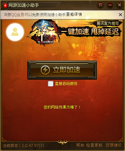 网游加速小助手推出了御龙在天专版,可能是庆祝12月20日的开拓公测发布吧,这是一款专用于QQ会员的御龙在天加速器,年费QQ会员可以免费使用,赶紧来加速吧。