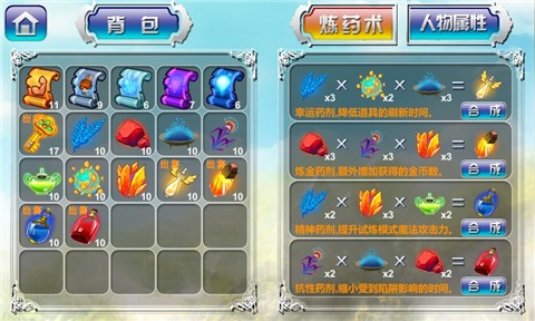 3. 利用符文杀死怪物,获得掉落的宝箱,宝箱可以获得道具,道具合成药剂后可以提升主人公的各项基本属性。