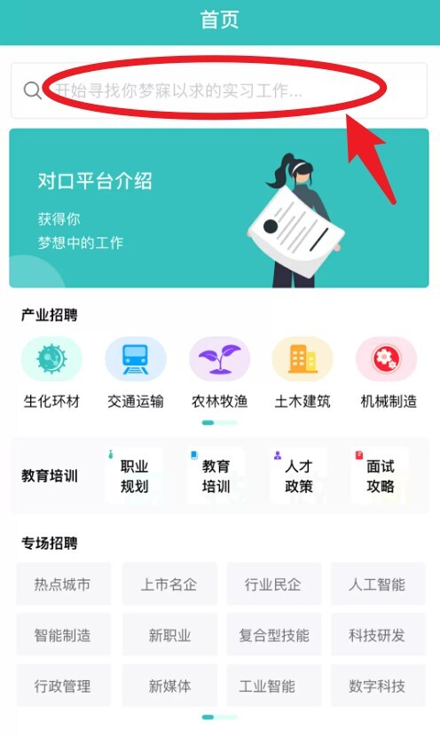 1、点击搜索栏,输入关键词快速寻找理想实习职位。