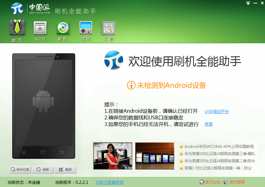 支持一键ROOT刷机必须之举,想玩游戏无限加金币,还有清除不需要的系统软件节省空间,中国派全能刷机助手一键搞定。