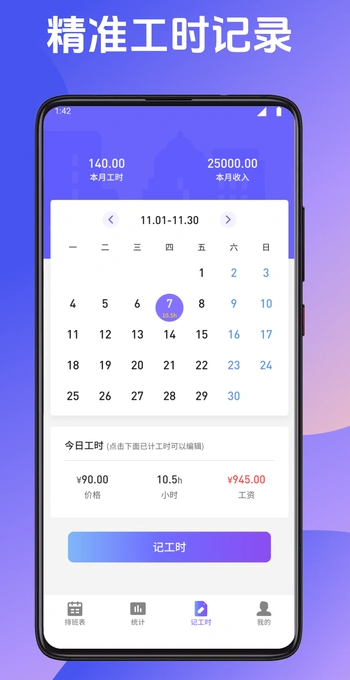 记加班记时应用可以帮助你一键在线记录加班账单,你可以添加加班日期、时长和地点等信息。此外,该应用还能统计你的加班总时长。用户需要在线设定每小时的加班费用,这样系统就能快速为你计算出总的加班金额,让你对自己的加班情况一目了然。