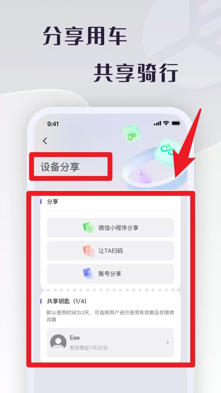 4. 在“设备分享”模块中,可选择账号或二维码方式将车辆权限分享给他人使用。