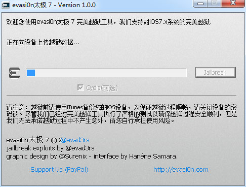 越狱过程是非常傻瓜式越狱,甚至越狱工具都是全中文版的,妈妈再也不用担心我的英文能力!为了保险起见还是请大家先备份设备资料,然后将设备连接PC,并在PC端上打开evasiOn太极7,越狱过程截图如下:
