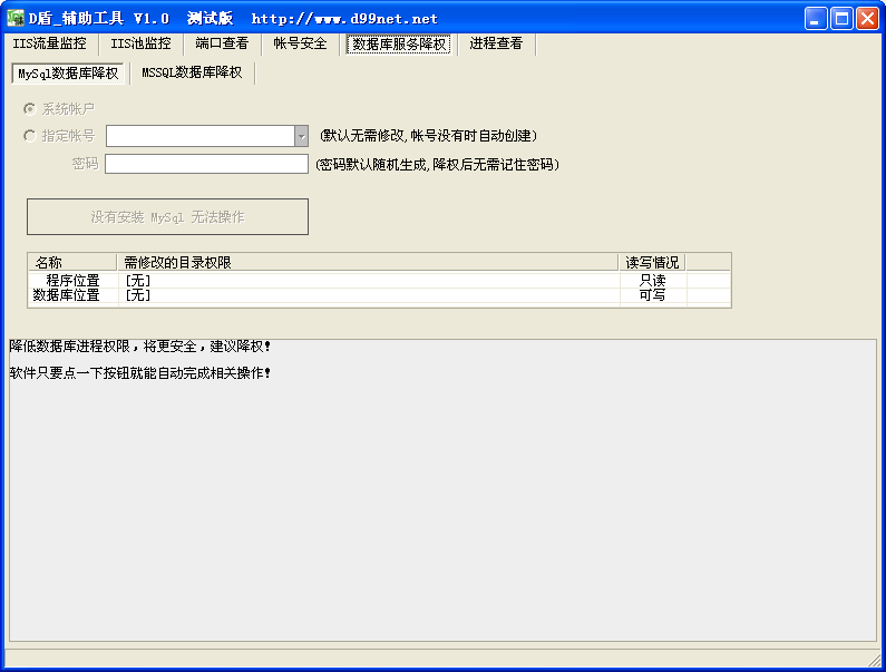 D盾辅助工具是一款可以方便监控IIS流量和IIS池的安全工具,还可以查看端口管理帐号,最主要的是可以对数据库服务降权,防止黑客轻易入侵。