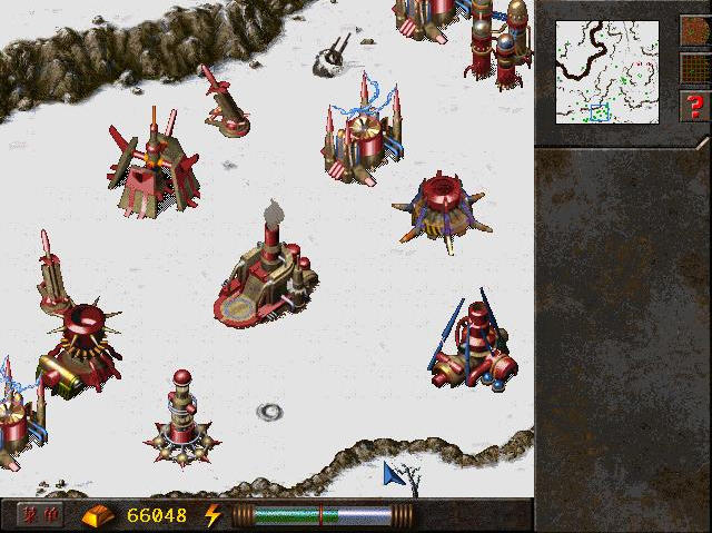 基地位于地图左上角的山丘上,是一个比较容易防守的地方。但是,仍须制造一些士兵。此时,基地的基础建筑物已经有武器研究中心和运载研究中心。在武器研究中心,需要依次研究行刑者和地狱火2运载研究中心也要依次研究哈雷、工程师和鳄。但是,只有这些是不够的,还必须建造动力研究中心,用来研究蟒,因为地狱火2是一种重型武器,只有蟒才能扛得起来这种大家伙。用地狱火2、鳄和蟒组成的机器人,是保卫居民点和终结战斗的最佳武器。不过,其昂贵的造价,迫使我们必须占领更多的居民点。