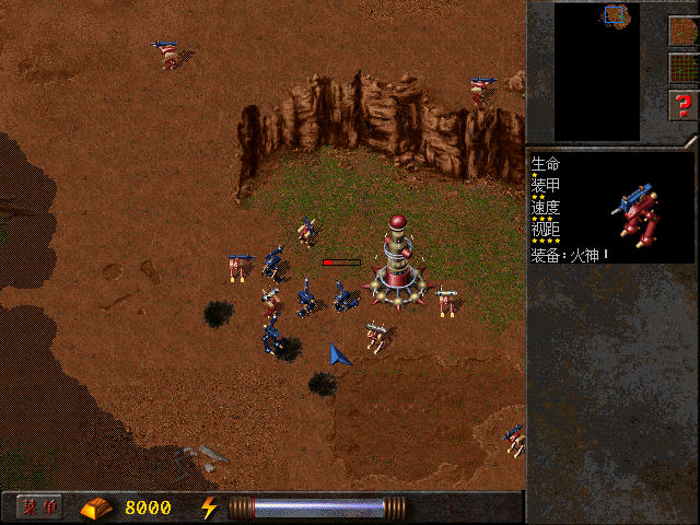 只有一个居民点是得不到足够的资源的。派遣一个机器人从右方路口出发,一直向前走,过桥后,会遇到一座小山,从山的左侧绕过去,上山占领。此处敌人很少去骚扰,只要稍加防守就行了。不过资源仍然不足,因此还要派出一个小分队,从基地一直向下,由靠地图边缘的一侧绕过小山,经过一场小战斗,占领第三个居民点,并加强防守,因为敌人随时会反攻。再派一支由重火力组成的分队,数量最好为兵力的一半,向地图的中心地区进发,去占领那里的居民点。只要坚持到消灭前来进犯的最后一个敌人,并得以巩固,就可控制局面。