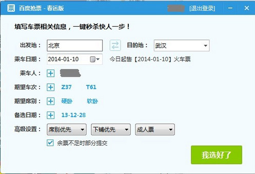百度卫士抢票版是最快的抢票神器,用户只需设定好火车票的相应信息,百度卫士就会在瞬间检测出是否有符合条件的车票,自动进行反复抢票,甚至连以往用户必须手动填写的验证码也由机器智能输入。系统抢票成功后,会直接引领用户进入12306支付页面,无需二次登陆,快速完成付款流程。由于百度卫士抢票版采用极速加载技术,精简了大量用户正常访问12306时加载的不必要的网页元素,真正从内核上优化网络访问速度,使抢票时间远远低于浏览器和插件类产品,大大地提高了订票的成功率。