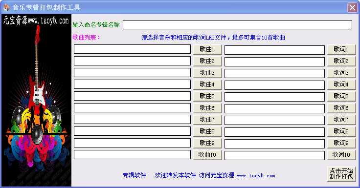 音乐专辑打包制作让你轻松制作属于自己的音乐专辑,可以将10首歌的制作成EXE文件,打包后的音乐exe可以在电脑任意运行,欢迎下载使用!