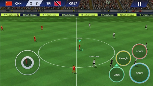 6、比赛开始后,屏幕左边用于控制移动,屏幕右边最大的图标【sprint】代表加速奔跑,【pass】代表传球,【through】代表射门,【shoot】代表铲球。