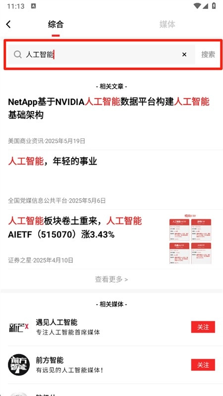 2. 输入内容的关键词,接着点击搜索,搜索范围涵盖文章、媒体账号以及个人账号等。