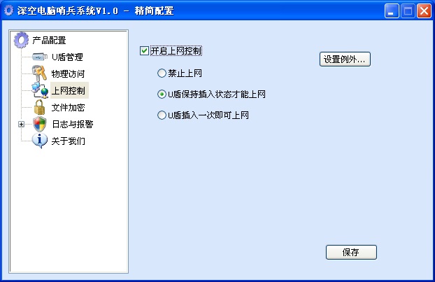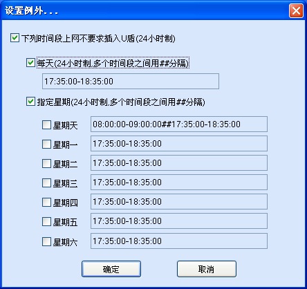 上述功能均提供例外时间段控制,在例外时间无需插入U盾即可正常登录系统,或正常上网。