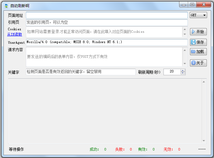 该网页自动刷新器支持自定义Cookies,支持以POST方式进行刷新。刷新过后会将刷新记录统计下来,实时保存刷新设置、加载刷新设置,让你的双手解放出来!