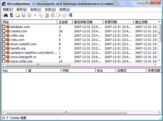 IECookiesView 1.77 汉化绿色特别版 一个可以帮你搜寻并显示出你计算机中所有的Cookies档案的数据,包括是哪一个网站写入Cookies的,内容有什么,写入的时间日期及此Cookies的有效期限..等等资料。你是否常常怀疑一些网站写入Cookies内容到你的计算机中是否会对你造成隐私的侵犯!使用软件来看看这些Cookies的内容都是些什么呢!如此你就不会再担心怀疑了。此软件只对IE浏览器的Cookies有效