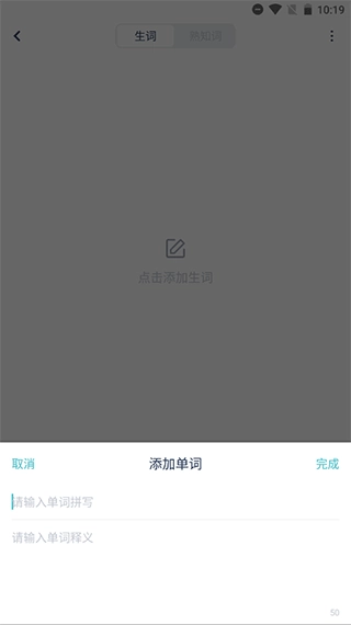 4、来到添加单词的界面,在相应位置输入单词的拼写以及单词的释义,随后点击【完成】按钮。