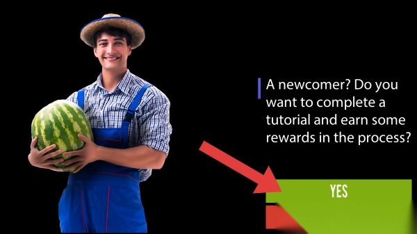 1. 此为一款农场或种植类型的新手引导界面,向新玩家询问是否完成教程以获取奖励。画面中的人物呈现农场角色形象,其作用是引导玩家决定是否开展新手教学。