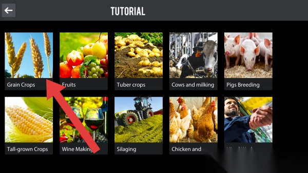 2、展示了“GrainCrops(粮食作物)”“Fruits(水果)”“Tubercrops(块茎作物)”等多种农业生产相关教程分类,用于引导玩家学习不同农场经营内容。