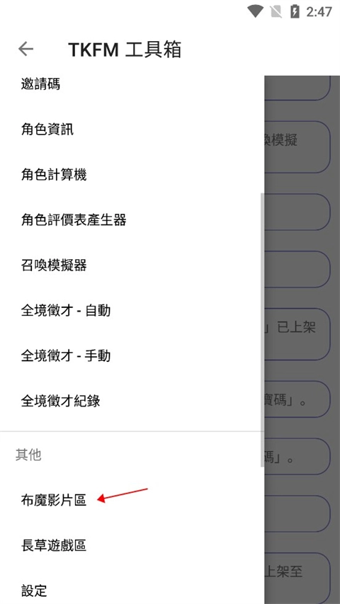 2、打开侧边栏菜单后,往下滑找到并点击布魔影片区。