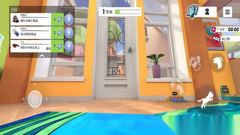 1. 操控猫咪行动,通过点击虚拟摇杆来把控方向,碰到家具时能够跳跃攀爬,进而探索房间。