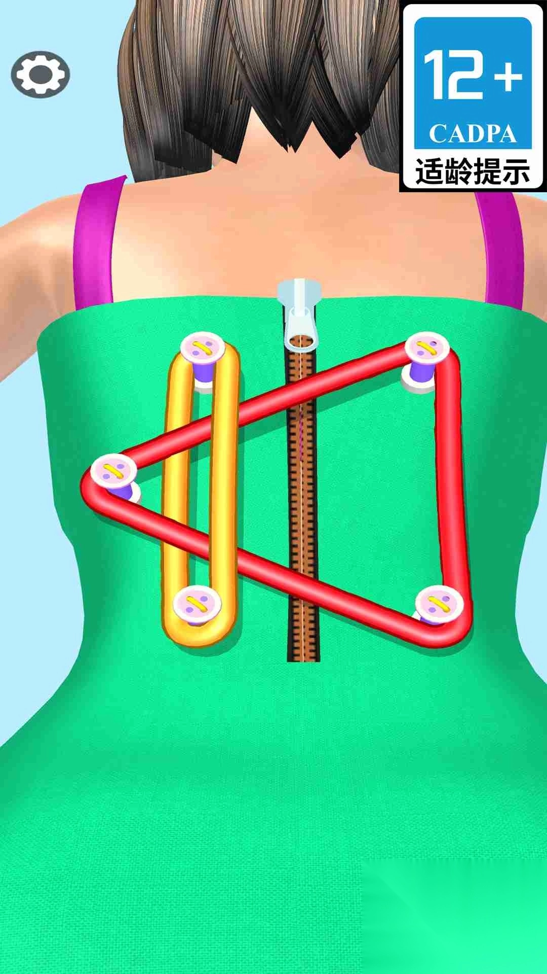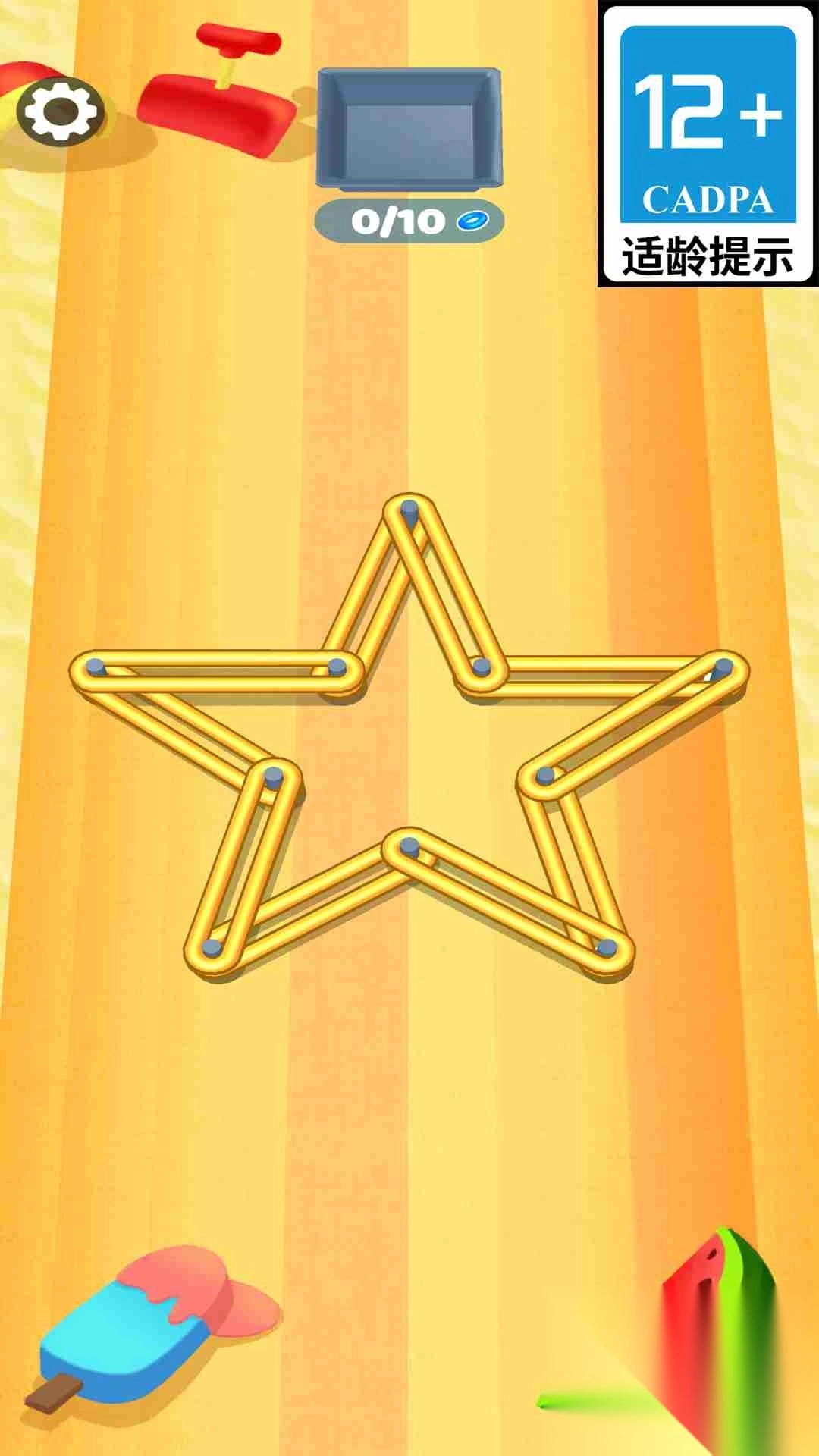 2、完成一关解锁下一关,难度逐渐提升,橡皮筋数量、缠绕复杂度增加。