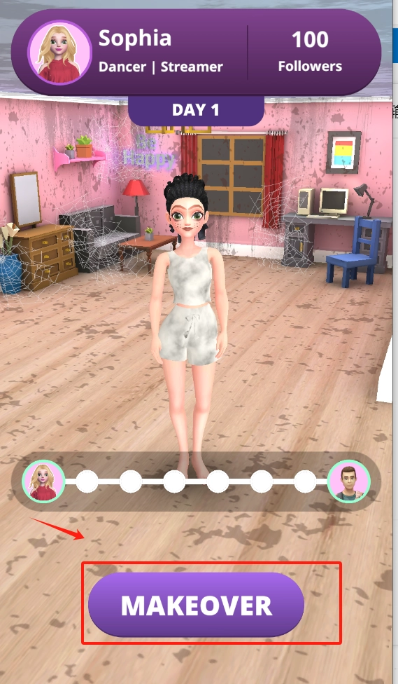 1. 轻点屏幕下方的粉色MAKEOVER按钮,为女孩Sophia进行换装打扮。