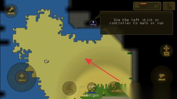 2、在地图场景,按提示用左侧摇杆(move)控制移动,探索黄色沙地,避开蓝色水域,熟悉操作。
