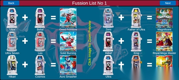 4、点击Fussion List,可以查看不同胶囊能合成什么奥特曼;