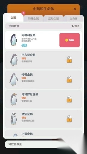 3、游戏仅有栖息地与动物这两条养成线路。其中,栖息地养成是重点,依靠消耗金币和爱心来实现升级,升级后会产出大量金币;动物养成线属于辅助线路,从多个方面提升产出效率。特别要强调的是,每当解锁一块新的栖息地,游戏地图就会出现较大变化,这无疑增添了许多期待感。另外需要说明,企鹅可以用金币直接购买,而那些功能强大且蠢萌可爱的各类生命体,则需通过抽卡的方式来解锁。