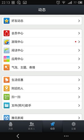 在正式版中手机QQ包含四个底栏按钮,分别是消息、联系人、动态和设置,而在低配版中手机QQ被缩减为了三个,取消了动态这一功能,喜欢在QQ里查看空间动态的用户看来是用不了了。游戏中心和应用中心什么的也砍掉了,这样一下子就能瘦身不少。