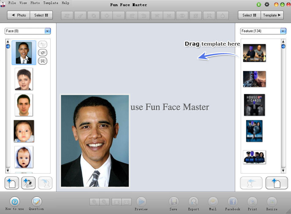 Fun Face Master是一个有趣的照片编辑软件。你可以用它来替换照片中的任何有趣名人的脸。只需要鼠标3次点击即可,您就可以把超人的脸换成你的脸。或者让你变成战士,骑士,尼姑,蒙娜丽莎,宇航员,总统等软件包括200多个高品质有趣的模板。创建一个搞笑的照片撼动你的朋友吧!