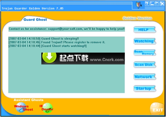 消灭特洛伊木马及蠕虫病毒,当你的计算机在浏览互联网时进行保护。Trojan Guarder 将会启动一个名为Grard Ghost的系统监控程序来监控所有在系统内存中运行的程序,所有打开的本地文件,实时的搜索特洛伊木马及蠕虫病毒,当特洛伊木马及蠕虫病毒出现的时候,它将会隐藏其它程序,立即把病毒消灭。同样它将会清理所有的系统连接文件以及注册表文件。