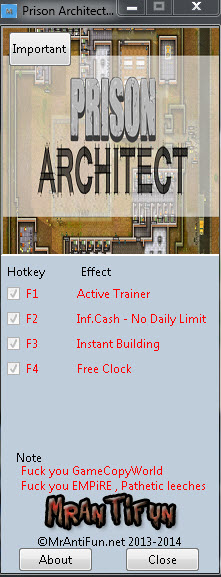 监狱建筑师修改器+4 v23c 绿色版 监狱建筑师修改器是一款同名游戏的辅助修改工具也是一款实用的作弊器,共添加了金钱、建造等多项功能,修改功能虽少,但是比较强大,可以帮助玩家获得更好的游戏体验哦。