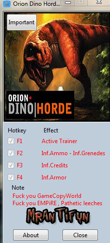 猎户座恐龙强袭修改器是一款大型游戏猎户座恐龙强袭的辅助作弊工具,共添加了无限弹药、手雷、金钱等4项强大功能,帮助玩家获得更好的游戏体验。