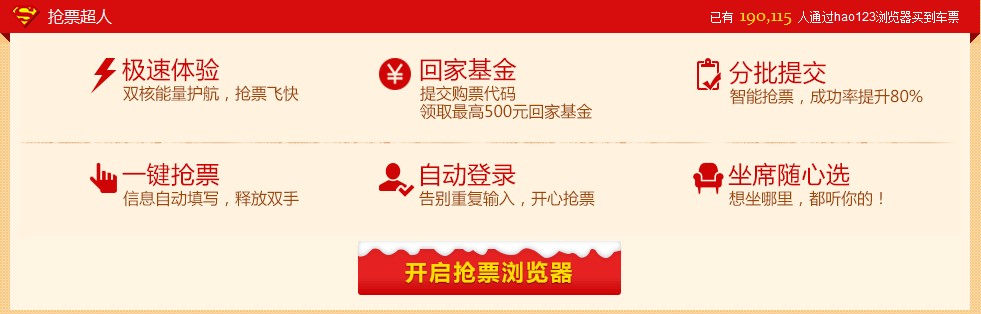 由于12306订票网站流量巨大,网络拥堵,登录缓慢,且车票一经放出短短几分钟就被一抢而空。为此,hao123推出了春运抢票浏览器,被网友热捧为“抢票神器"。其原理在于能够记录个人信息,自动重复登录,直到登录成功,代替缓慢的人工操作。并通过对12306网站的不断刷新和监控,一旦有人退票,该抢票神器能立即发现。此外,hao123抢票浏览器从查询到下单可以直接勾选,不需再填写任何信息,有了这些便利功能,抢票成功率将提高10倍以上。