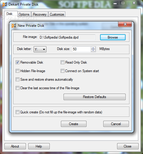Dekart Private Disk可以根据自己的需要来创建密码,包括盘符以及磁盘大小、只读盘、可移动盘等。