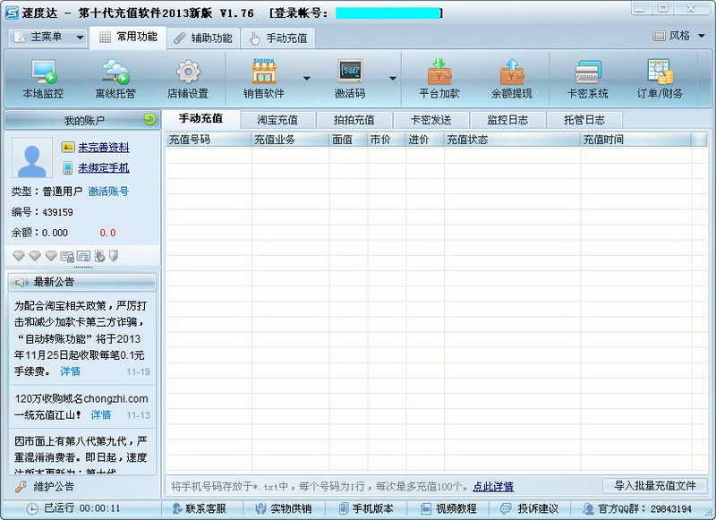 3、系统稳定,资金安全:软件自动识别号码充值,确保充值资金准确安全,避免充值卡被盗、泄密等意外发生。