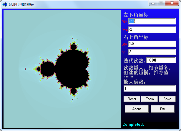 分形几何生成器是一个开放源代码的工具,内附VC源代码。这款分形几何生成器演示了曼德布集的绘制和放大,按<Reset>可以恢复原始图形,绘制完成后按住鼠标左键在图片上拖动即可选中放大区,按<Zoom>可以放大,理论上可以放大任意倍,但由于计算精度的原因,放大倍数超过一百万亿时会出现马赛克现象。