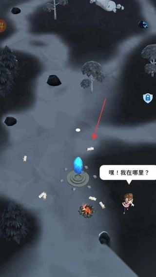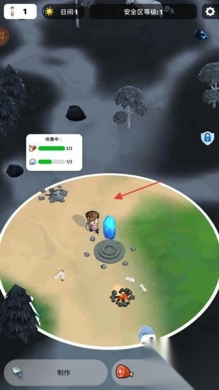 1、在初始场景(红箭头),靠近蓝色水晶,触发角色“我在哪里”对话,激活安全区,探索周边(收集物资石头)。