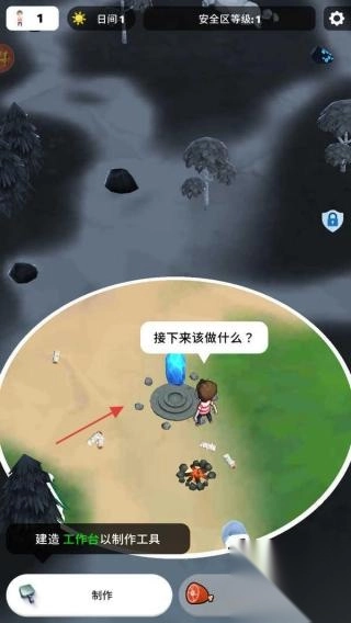 3、点击标有红箭头的【制作】按钮,接着选择“建造工作台”选项,消耗相应资源后搭建工具台,成功搭建后即可解锁制作配方,从而推进生存流程。