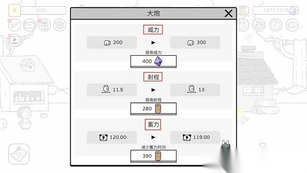 4、提升设施的战斗力,例如这里是大炮,包括威力、射程、蓄力等可以自己调整。
