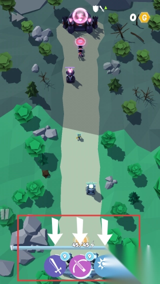 2、战斗场景,用下方技能(剑、斧、法球),按箭头指引,部署单位,沿路线推进,攻击敌方建筑。