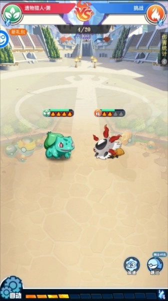 4、选好了精灵后就可以开始作战了,游戏可以放置挂机,会自动攻击,当敌人太过强大时也可以选择先强化再出战。