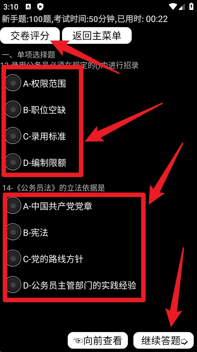 5. 在答题过程中,你能够点击“继续答题”或者“向前查看”来切换题目,这样有助于你进行反复练习,并方便查阅前面的内容。