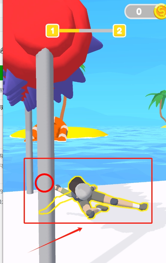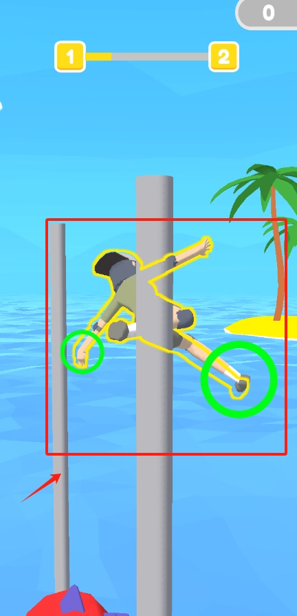 3、红框圈出的角色趴在灰色柱子旁,进度条显示1,2,按提示让角色爬到顶部就能继续。