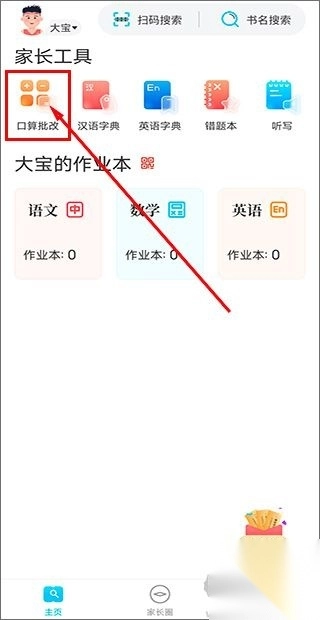 1. 开启作业精灵,进入软件,在主页即可瞧见口算批改、汉语字典、英语字典、错题本等家长工具,点击“口算批改”进入。